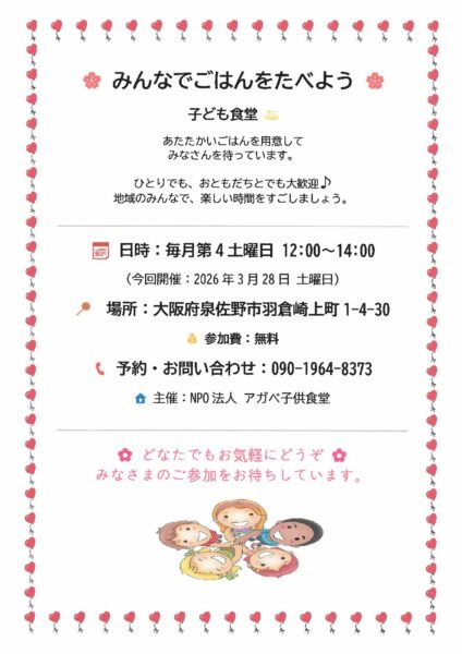 南大阪こども食堂ネットワークに登録されている南大阪(高石市~岬町)のこども食堂開催日のご案内です!